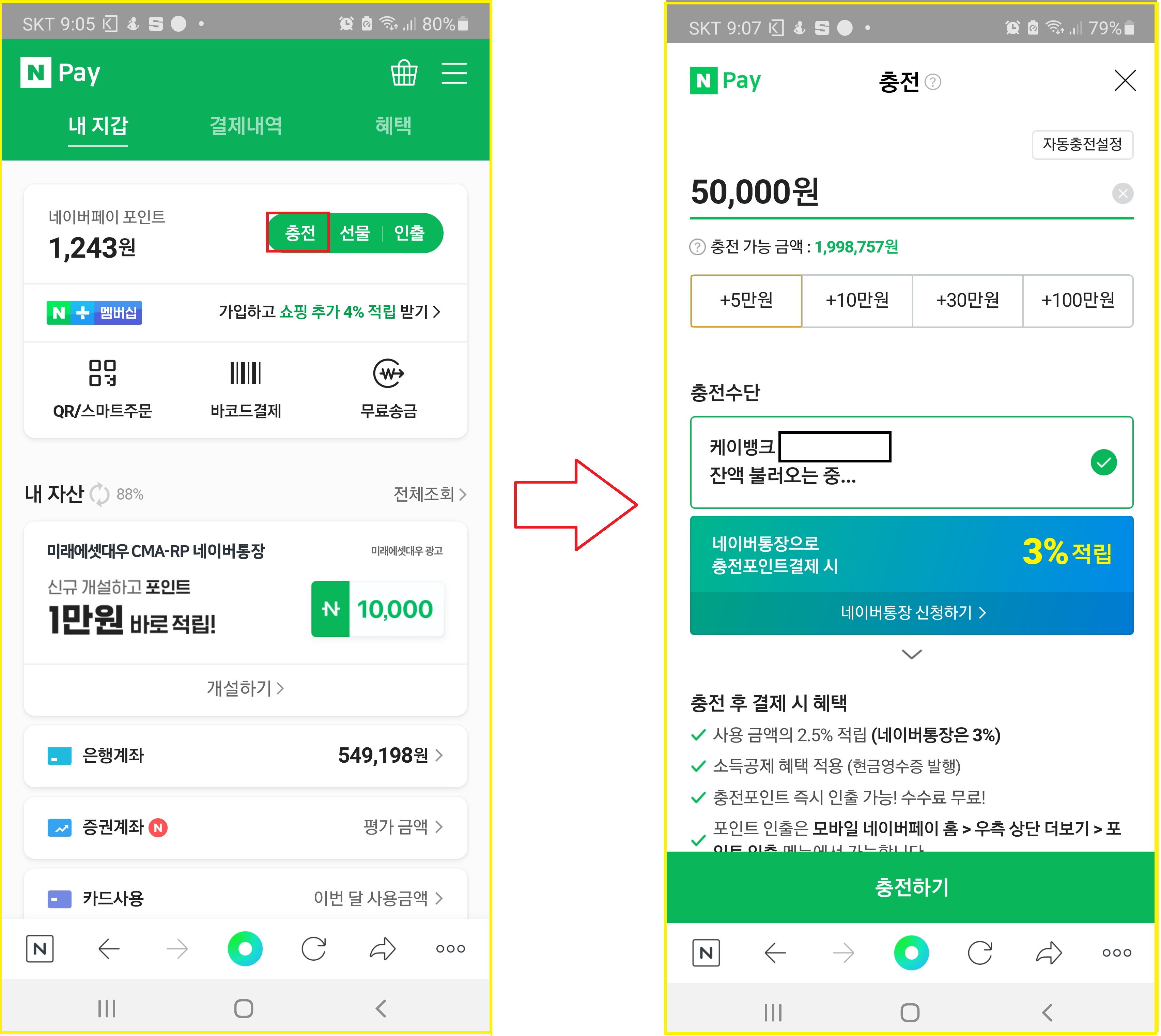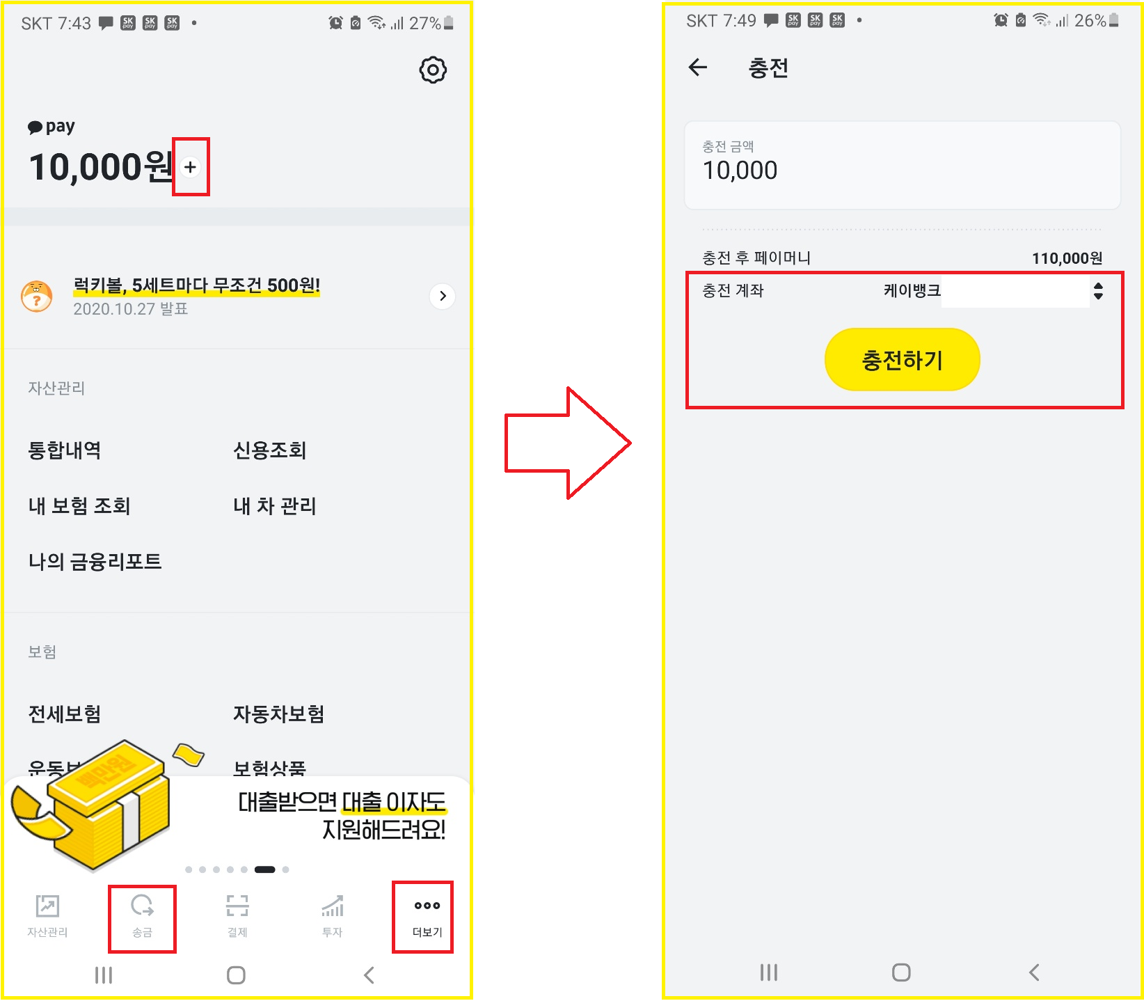 최소 충전금액이 십만원이라 여유돈이 없으면 충전금액을 다시 인출해서 케이뱅크로 보내고 다시 충전해야 합니다.