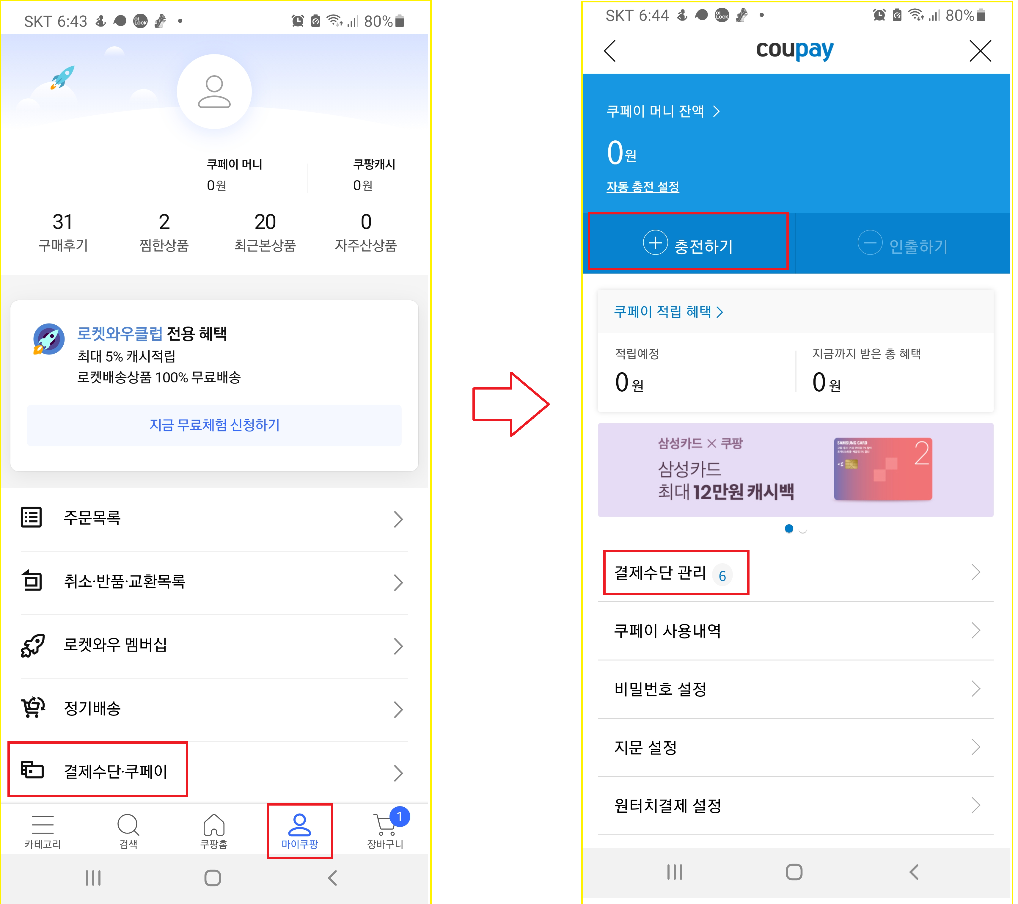 쿠페이는 쿠팡의 간편결제입니다. 쿠팡 앱에서 마이쿠팡을 누르시고 결제수단·쿠페이로 들어가시면 됩니다. 케이뱅크 계좌가 등록되어 있지 않다면 결제수단 관리에서 케이뱅크를 등록하시고 등록 후에는 충전하기로 쿠페이를 충전하면서 행운상자를 얻으시면 됩니다.