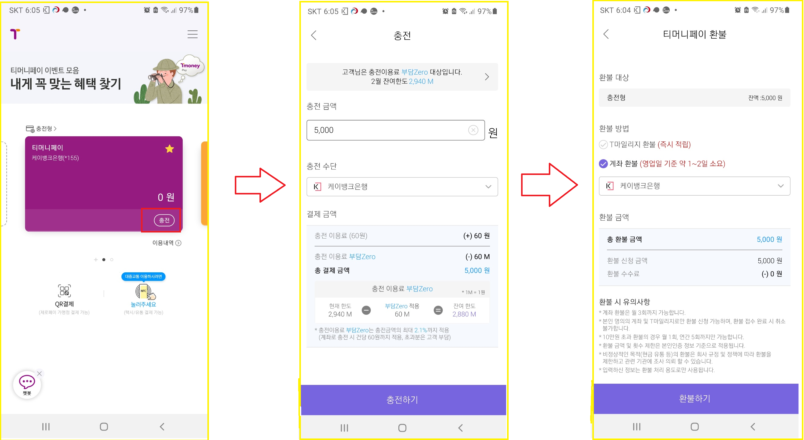 티머니 페이에서 충전을 눌러서 충전을 하면 행운상자를 얻을 수 있습니다. 다만 최소 충전 금액이 5000원이고, 계좌로 환불 시 월 3회까지만 가능하기 때문에 충전금액을 어느 정도 모아서 한꺼번에 환불을 하는 것을 추천드립니다. 다만 계좌환불은 영업일 기준 약 1~2일 소요된다고 하기 때문에 여유돈으로 하시는 것이 좋을 거 같습니다.