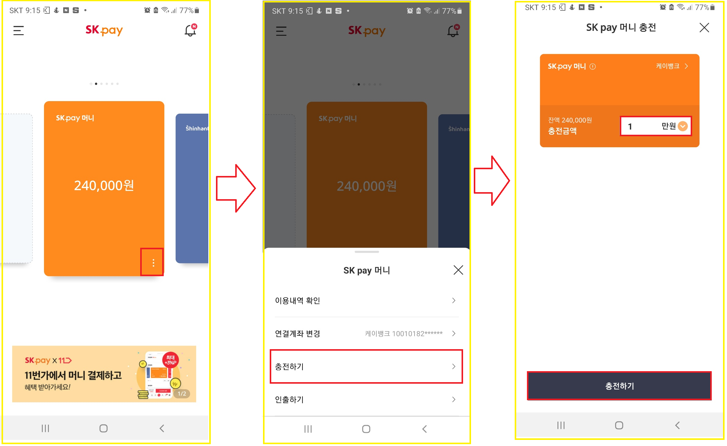 SK pay 어플 설치 후 점 세개가 세로로 나란히 있는 영역을 누르면 충전하기 메뉴가 있습니다. 이 메뉴를 눌러서 SK pay를 충전하면 되는데 최소 충전금액은 1만원부터 가능합니다.
