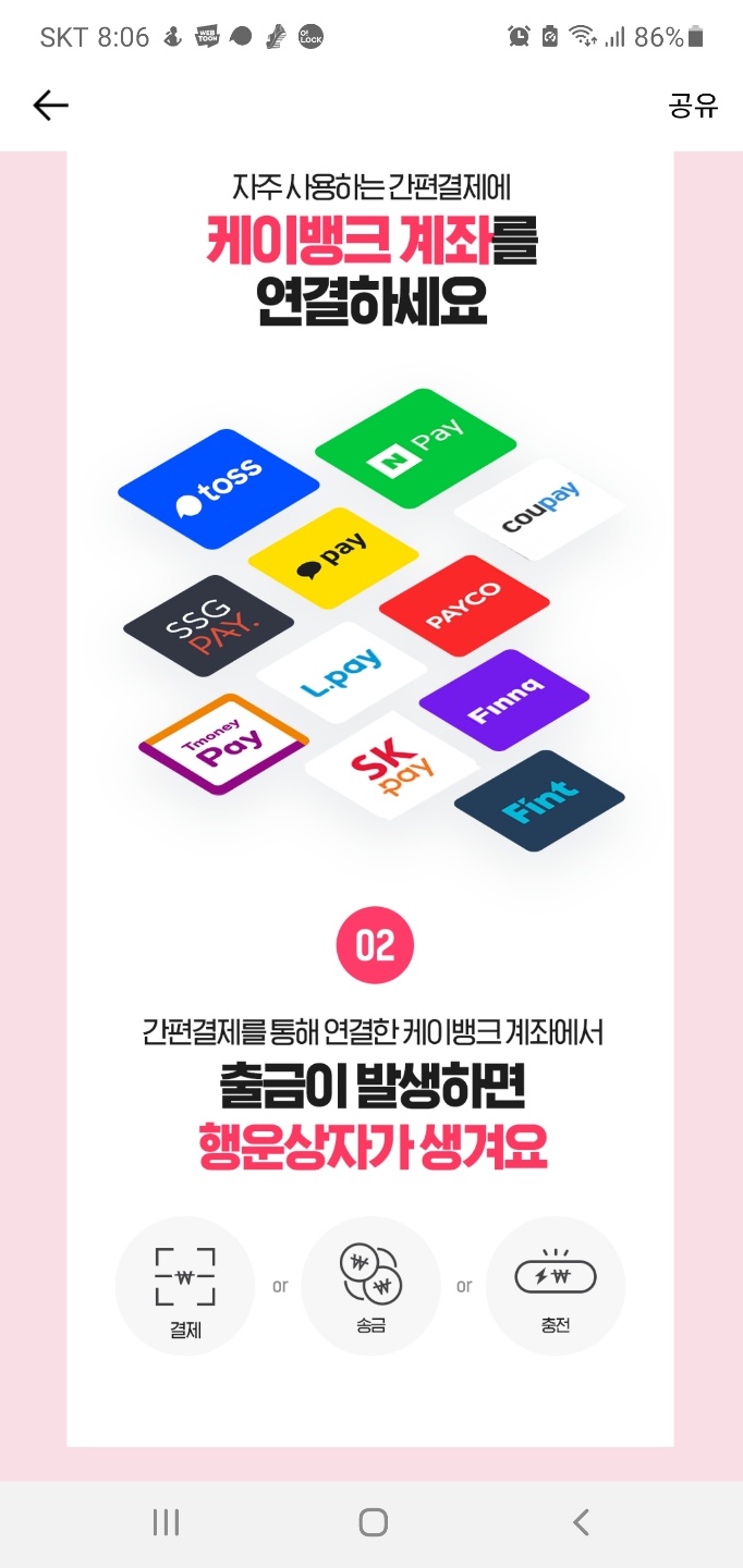 간단히 소개해 드리면 케이뱅크를 계좌를 개설한 뒤 개설된 계좌를 각종 페이와 연동하고 송금이나 충전, 결제 서비스를 이용할 때마다 현금을 얻을 수 있는 행운상자를 하나씩 얻을 수 있습니다.