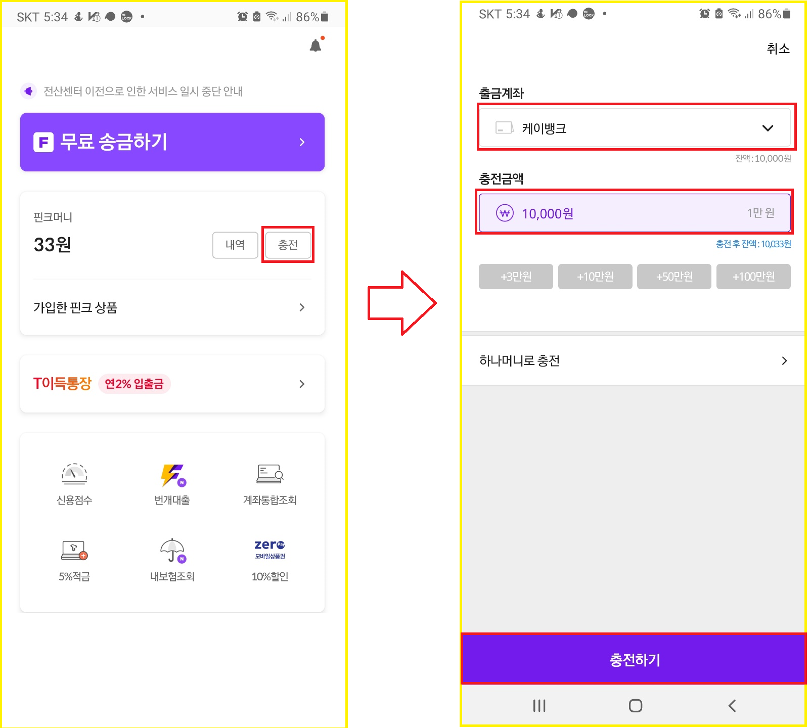 충전이 끝나면 송금버튼을 눌러서 다시 케이뱅크 계좌로 이체하시면 됩니다. 송금은 월 10회 무료입니다.