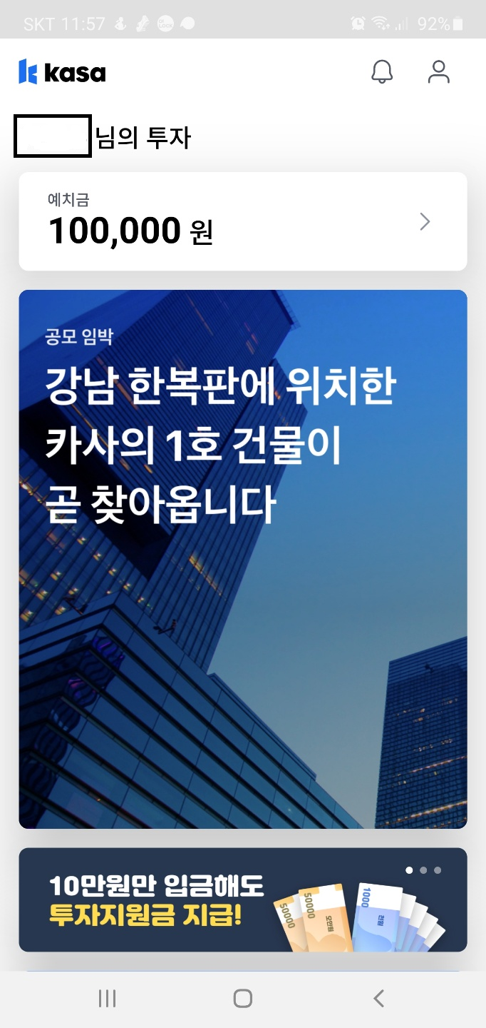 아직 서비스 오픈전이라 10만 원 입금 시 오천 원 투자지원금 이벤트를 하고 있습니다. 다만 투자지원금은 공모 시작 당일 카사 예치금 계좌로 입금된다고 하네요.